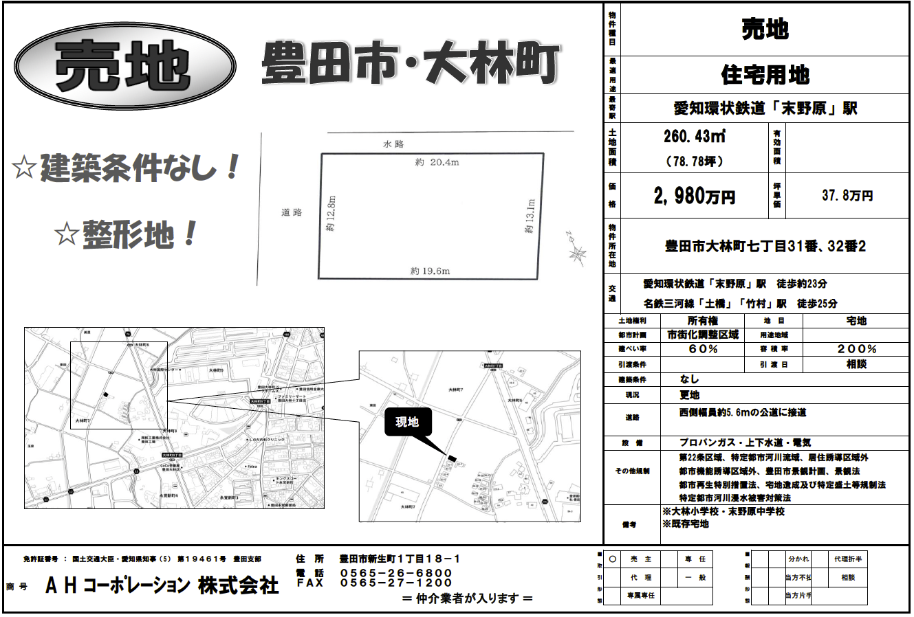 AHコーポレーション株式会社 愛知県豊田市新生町1丁目18-1 TEL.0120-726-680 仲介